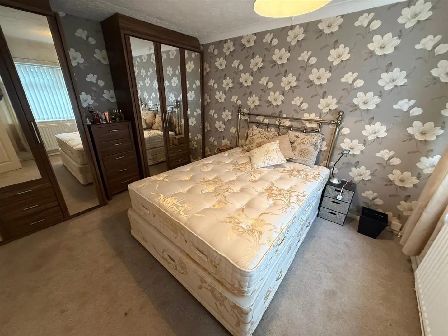 A double bedroom situated to the front elevation of the property. Warmed by a central heating radiator, tastefully decorated in neutral tones incorporating a feature wall and benefiting from a UPVC double glazed window and built in wardrobes providing useful storage and a built in dressing table.