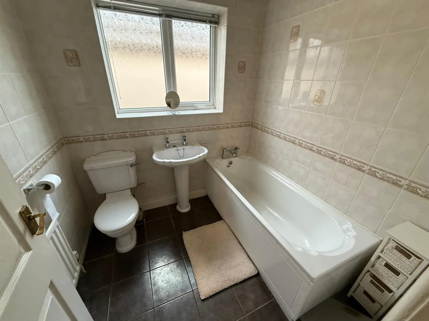 The bathroom has a tiled floor and walls, a UPVC double glazed window with privacy glass and is fitted with a suite comprising of a panelled bath, a wash hand basin and a low level WC.