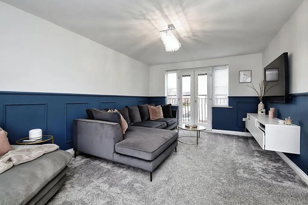 The beautifully presented living room offers fine interior design. Warmed by a central heating radiator, tastefully decorated and benefiting from stylish half panelled walls and double glazed French doors with double glazed windows to either side and a Juliette balcony.