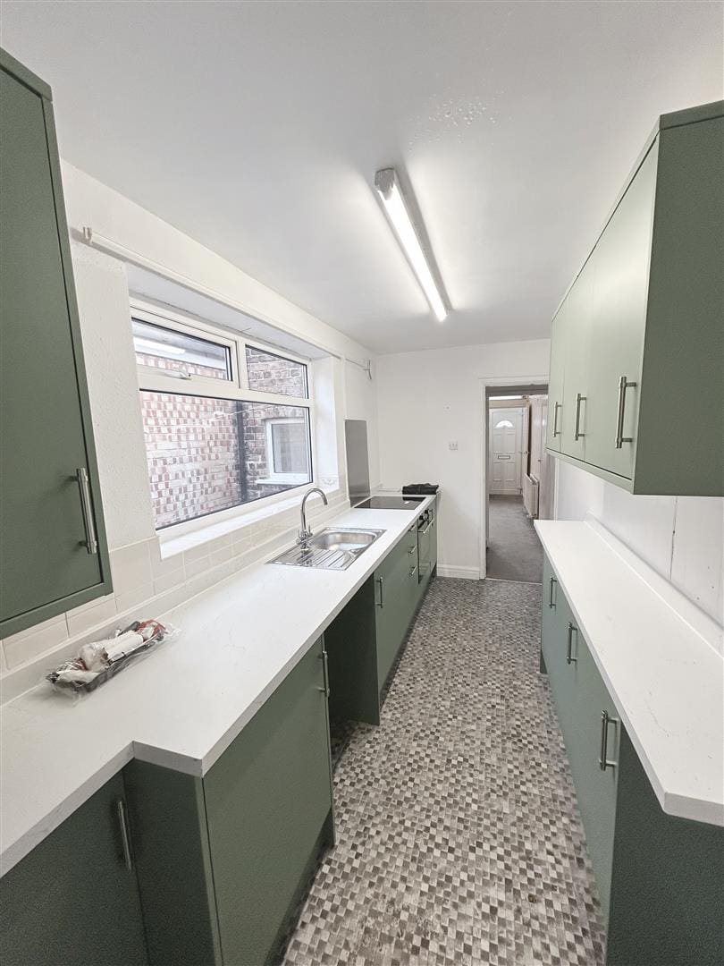 The newly fitted kitchen is fitted with a comprehensive range of wall, floor and drawer units with contrasting worktops incorporating a stainless steel sink and drainer. Warmed by a central heating radiator and benefiting from an integrated electric oven and hob, vinyl flooring and a UPVC double glazed window overlooking the side of the property.