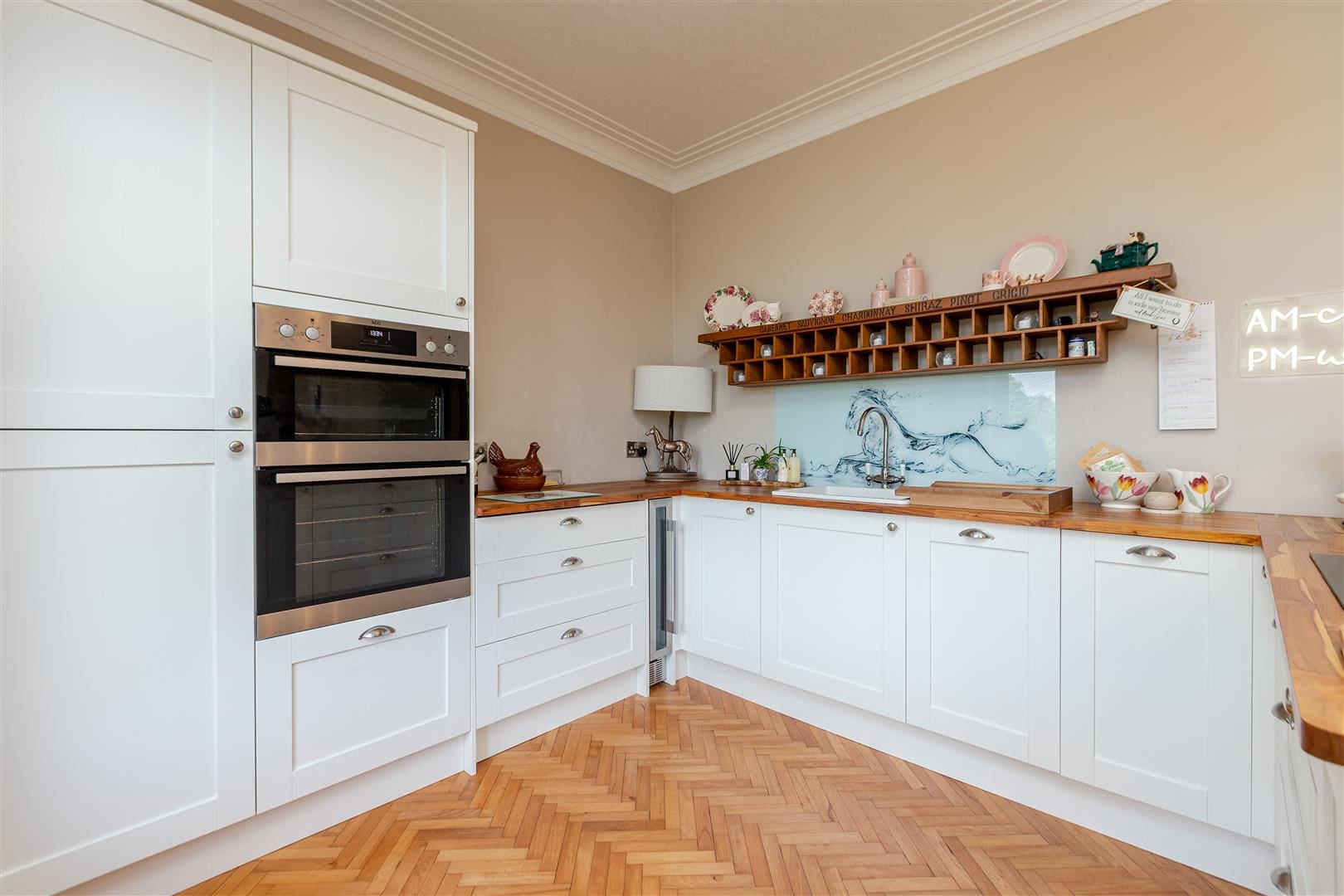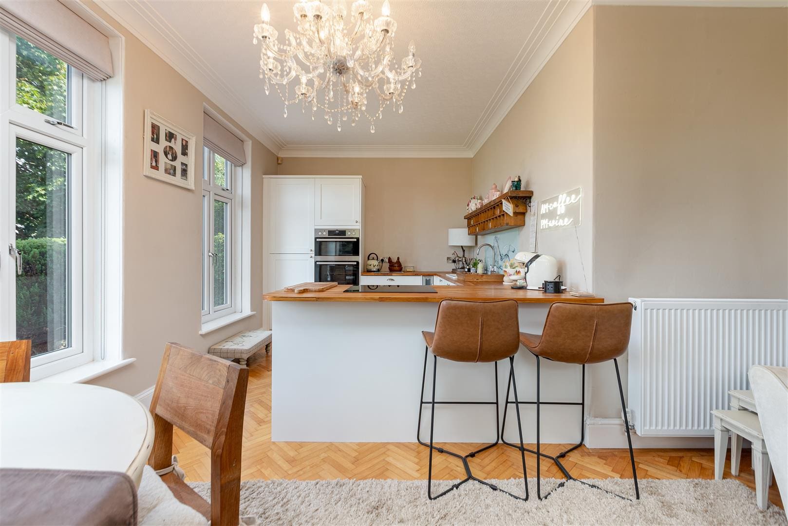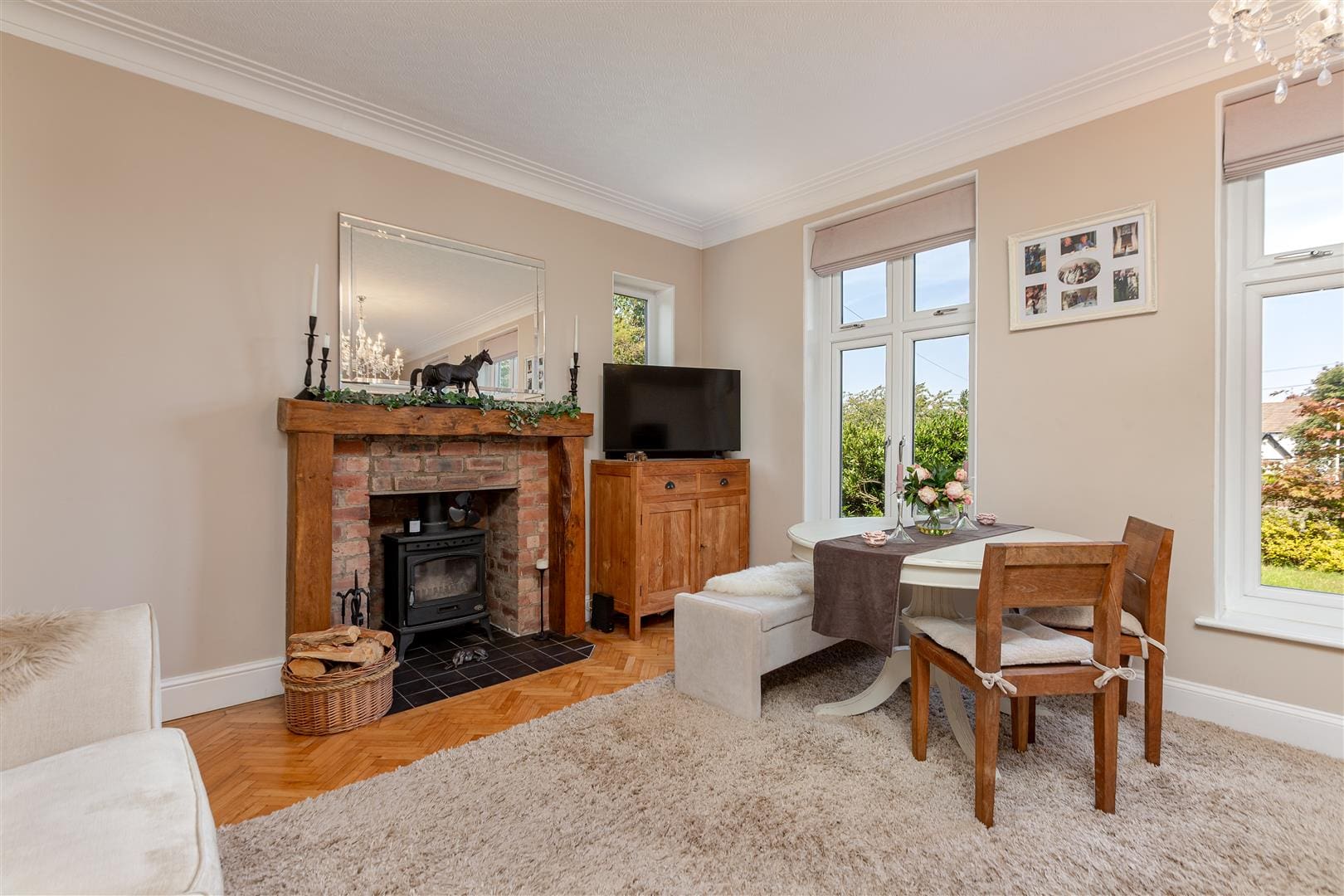 The modern and most contemporary kitchen which is less than one years old is simply stunning. Fitted with a comprehensive range of wall, floor and drawer units with contrasting butcher block worktops incorporating a ceramic sink. The kitchen benefits from a number of integrated appliances including a double oven, and electric hob and a slimline dishwasher. The beautifully presented family room is situated to the front elevation of the property. Warmed by a central heating radiator, tastefully decorated and benefiting from original Parquet flooring, three large double glazed windows and a wooden fire surround with a tiled hearth and a log burning stove.
