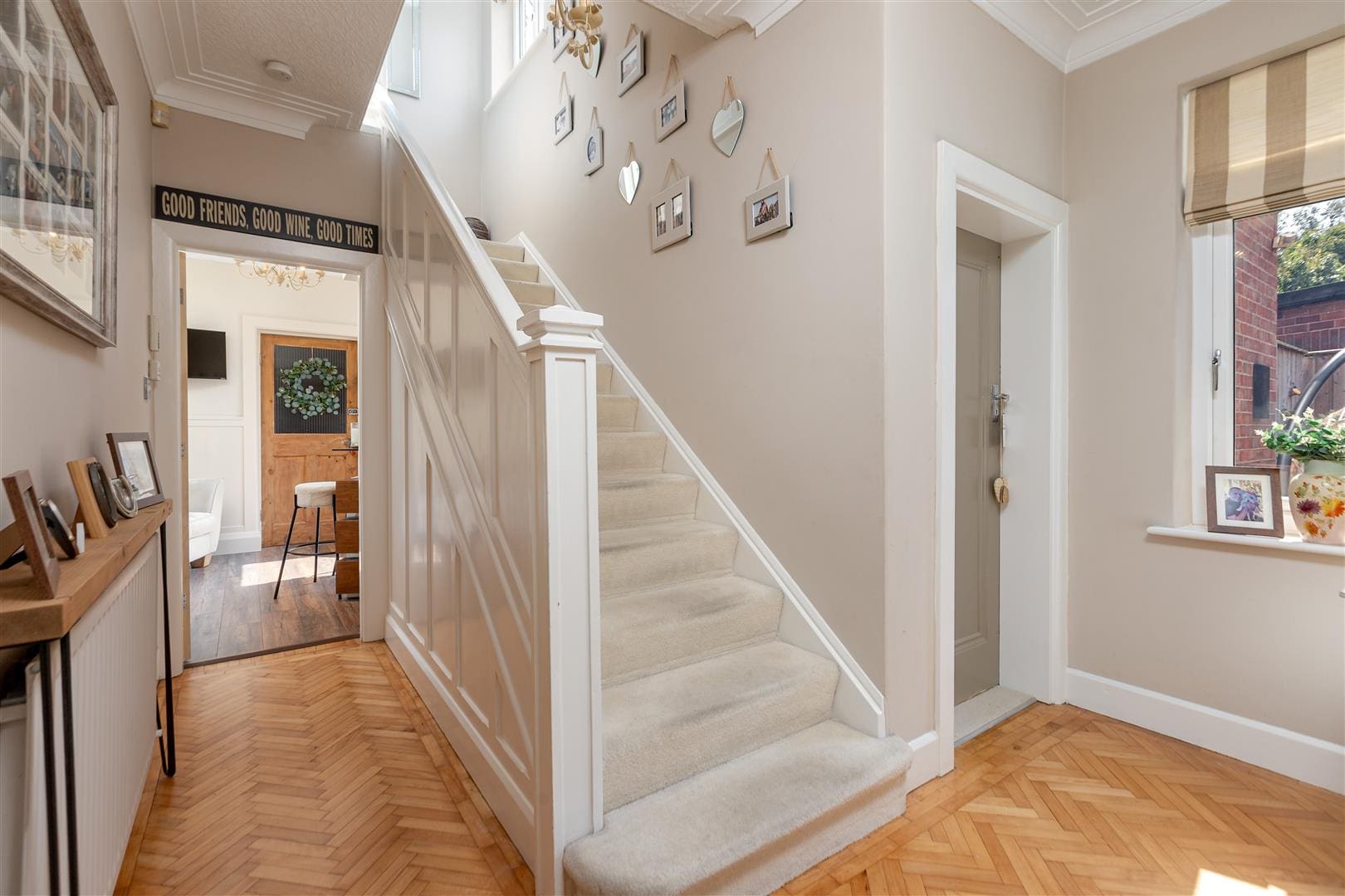 A most welcoming entrance hallway warmed by a central heating radiator, tastefully decorated in neutral tones and benefiting from original solid wood Parquet flooring and a window overlooking the side elevation of the property.