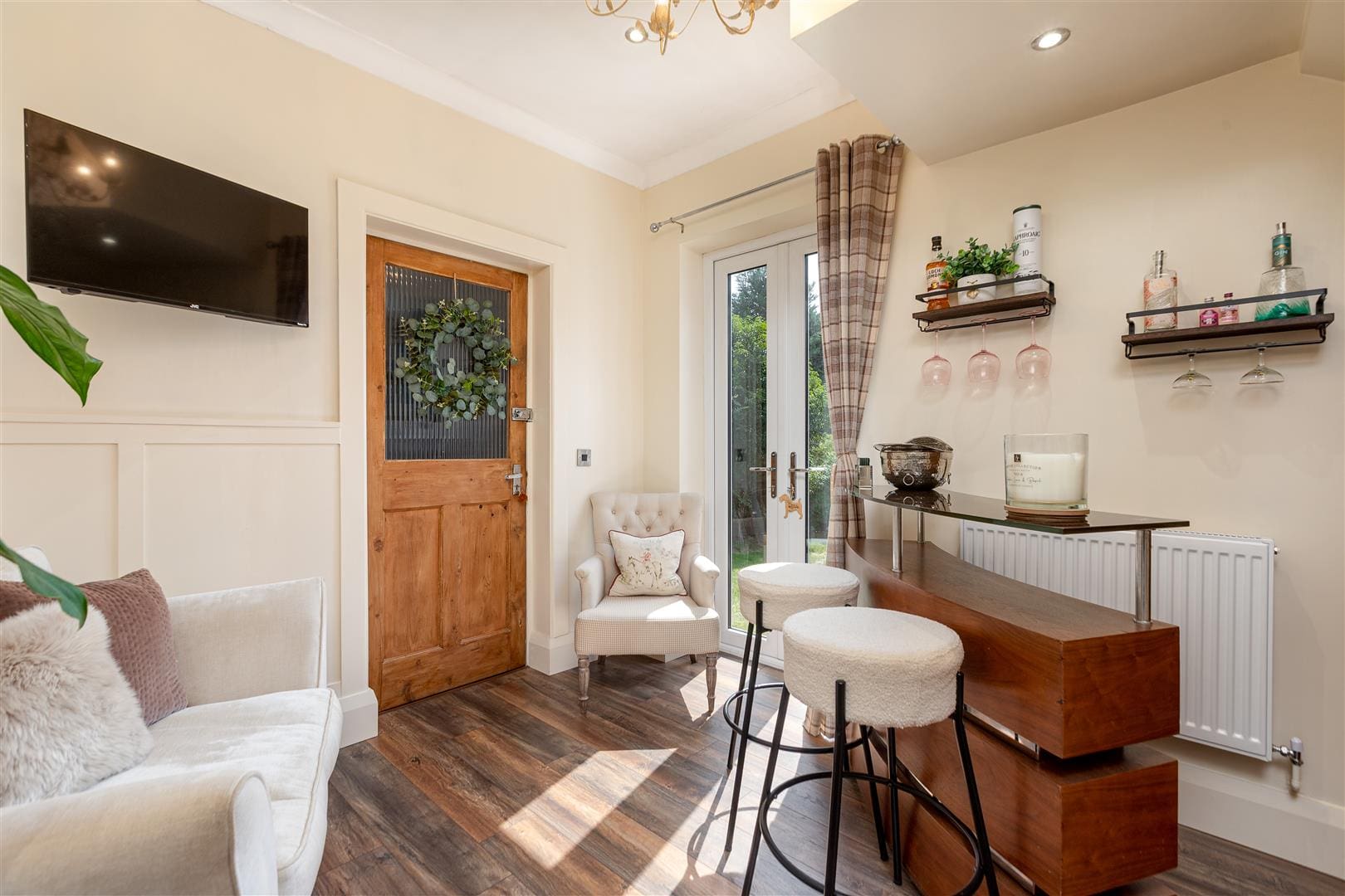 The further reception room which is currently used as a snug room is situated to the rear elevation of the property. This multi-use room has ability to be reconfigured to suit different activities, from work to play to relaxation, warmed by a central heating radiator, tastefully decorated in neutral tones and benefiting from laminated flooring and double glazed French doors which lead out to the rear garden. A door leads into the integral garage.