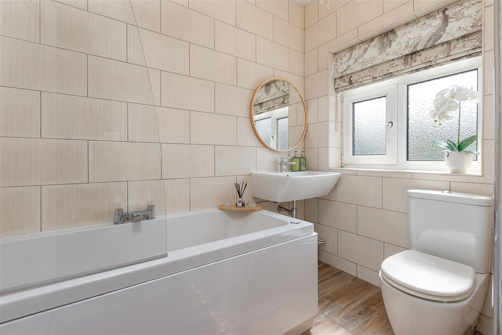 The bathroom has vinyl flooring, tiled walls, a double glazed window and is fitted with a modern suite comprising of a Jacuzzi bath, a wash hand basin, a low level WC and a towel radiator.