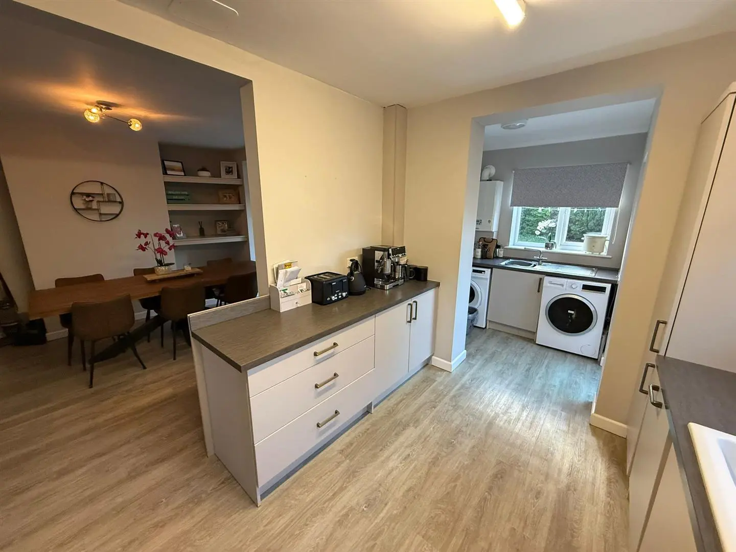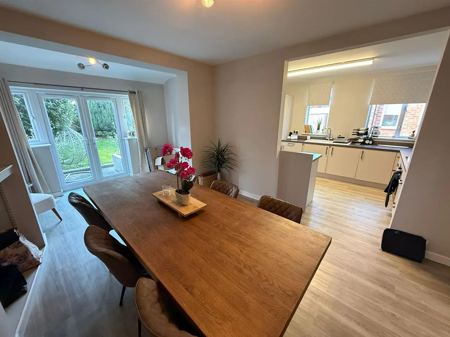 The stunning dining room is warmed by a central heating radiator, is tastefully decorated in neutral tones and benefits from vinyl flooring. An arch way leads in to the kitchen, with a further archway leading into the garden room.