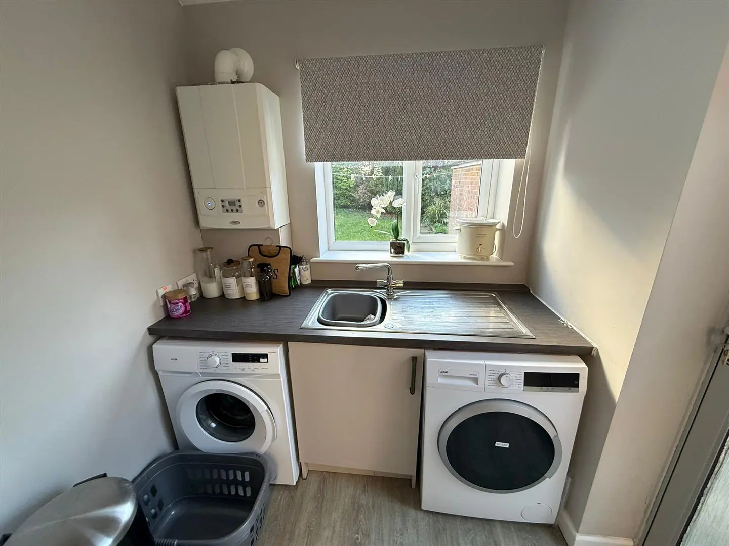 The utility room has vinyl flooring, a UPVC double glazed window, plumbing for an automatic washing machine and is fitted with a floor unit with a contrasting worktop incorporating a sink. A door leads out to the side elevation of the property.