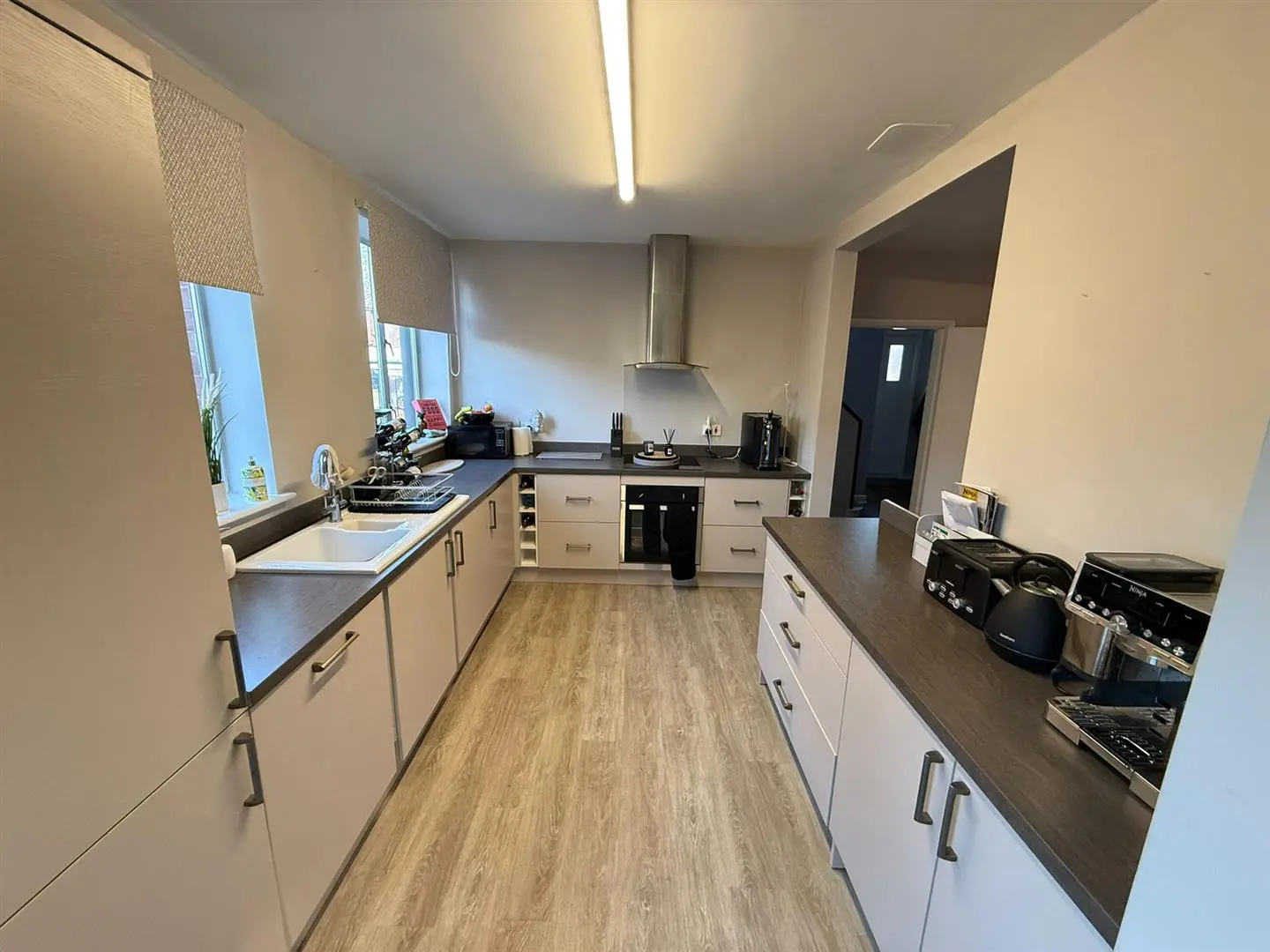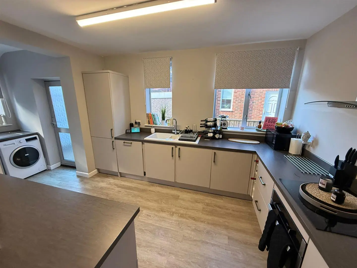 The modern and most contemporary kitchen is fitted with comprehensive range of wall, floor and drawer units with contrasting worktops incorporating a ceramic sink. The kitchen benefits from vinyl flooring, a UPVC double glazed window to the side elevation of the property and a number of integrated appliances including an electric oven and hob with overhead extractor hood, a fridge freezer and a dishwasher.