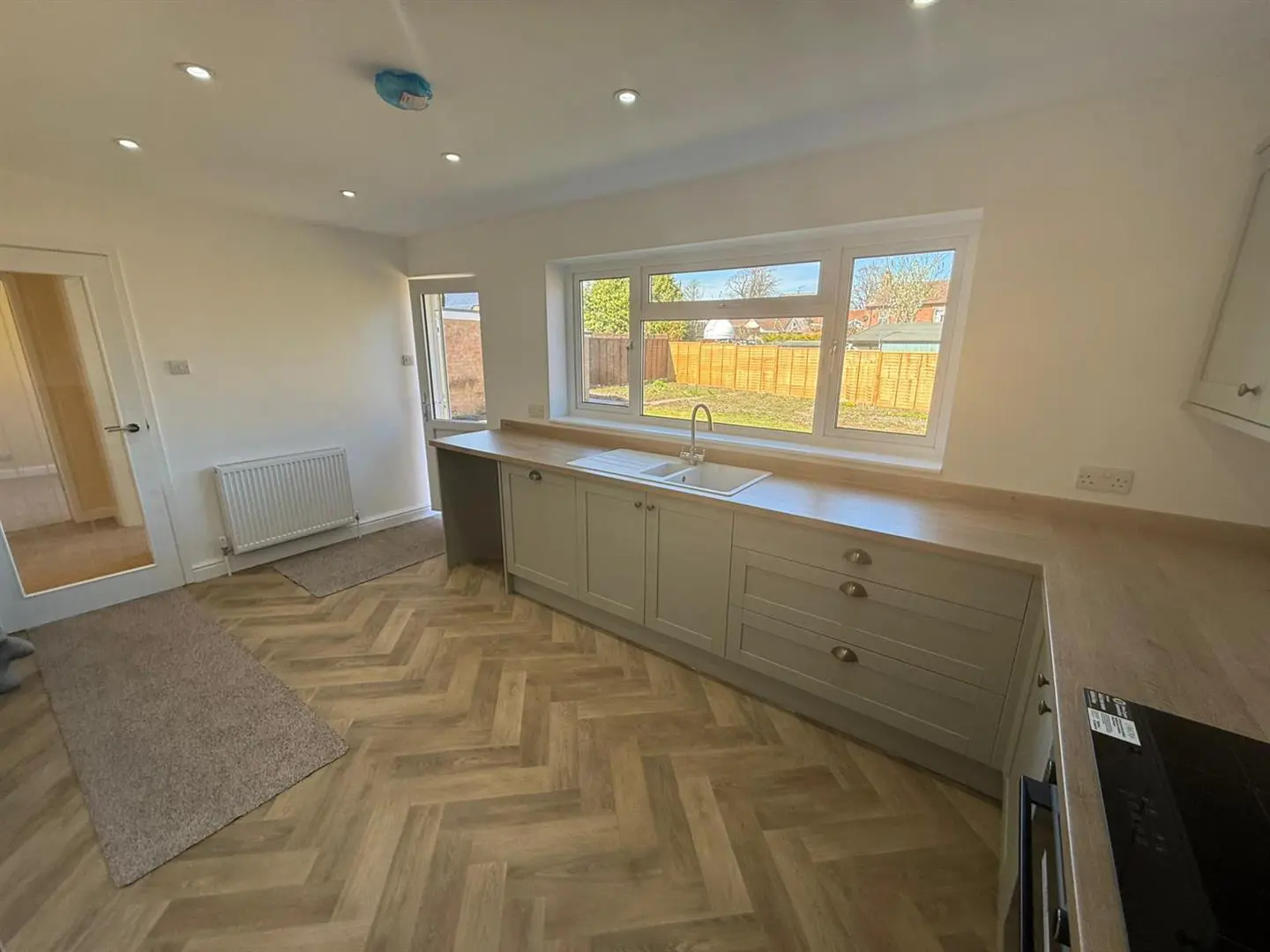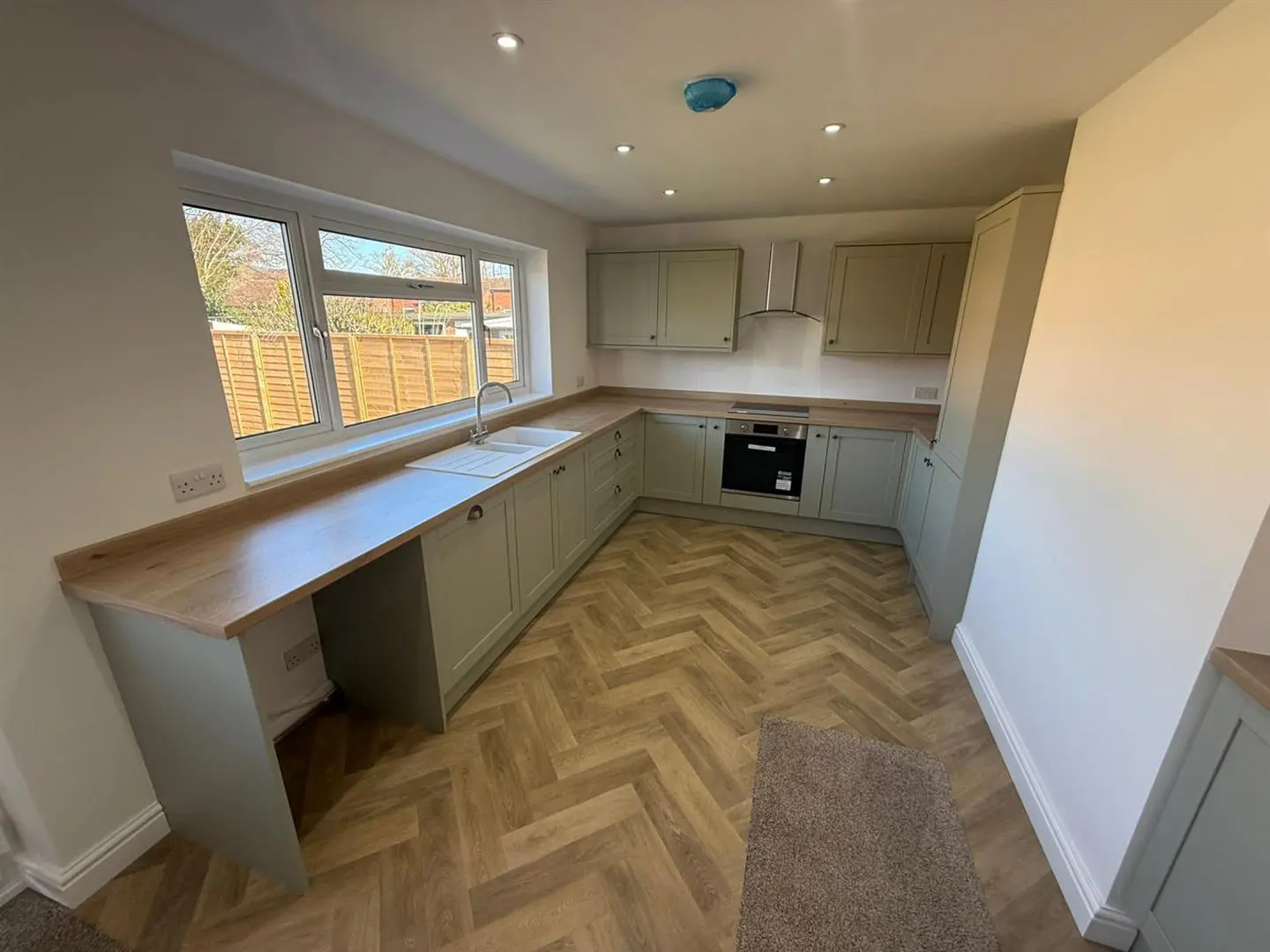 The newly fitted kitchen is simply stunning. Fitted with a comprehensive range of wall, floor and drawer units with contrasting worktops incorporating a composite one and a half bowl sink and drainer. The kitchen benefits from stylish vinyl flooring, inset spotlights to the ceiling, a UPVC double glazed window and a number of integrated appliances including an electric oven and hob with overhead extractor hood, a dishwasher and fridge freezer. There is ample room for a dining table. A half glazed door leads out to the rear garden.
