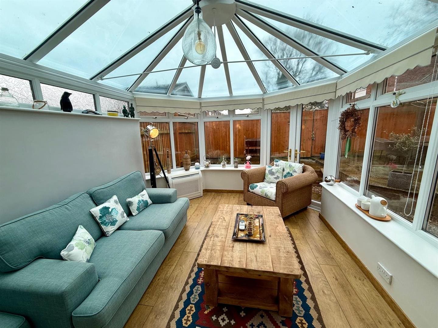 The delightful conservatory offers fine views overlooking the rear garden. Warmed by an electric heater and benefiting from laminated flooring and an air conditioning unit. French doors lead out to the rear garden.