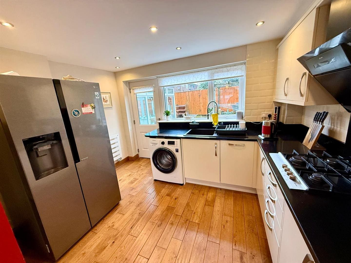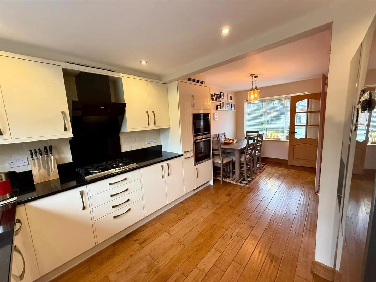 The kitchen is fitted with a comprehensive range of wall, floor and drawer units with contrasting worktops incorporating a composite sink and drainer. The kitchen benefits from engineered wood flooring, an integrated electric oven with a gas hob and over head extractor hood, plumbing for an automatic washing machine, a slimline dishwasher and a UPVC double glazed window to the rear elevation of the property. A composite door leads out to the rear garden. The kitchen is open plan with the dining room.