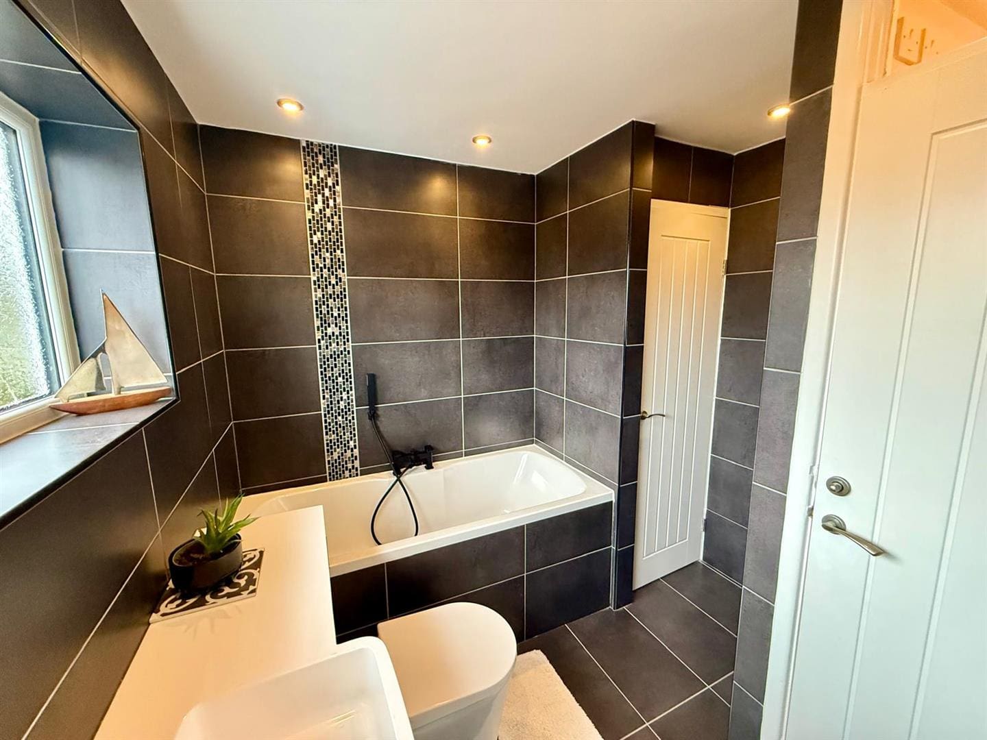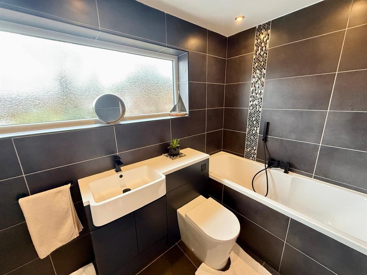 The stunning bathroom is warmed by a towel radiator, has a tiled floor and walls, a UPVC double glazed window with privacy glass and is fitted with a modern suite comprising of a panelled bath, a walk in shower cubicle with shower, a wash hand basin inset on to a vanity unit and a low level WC.