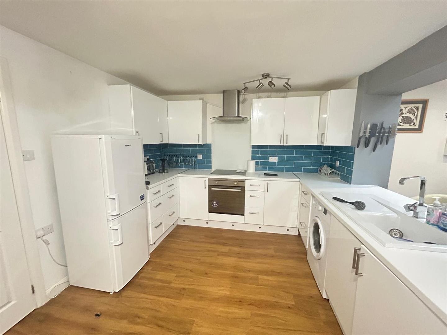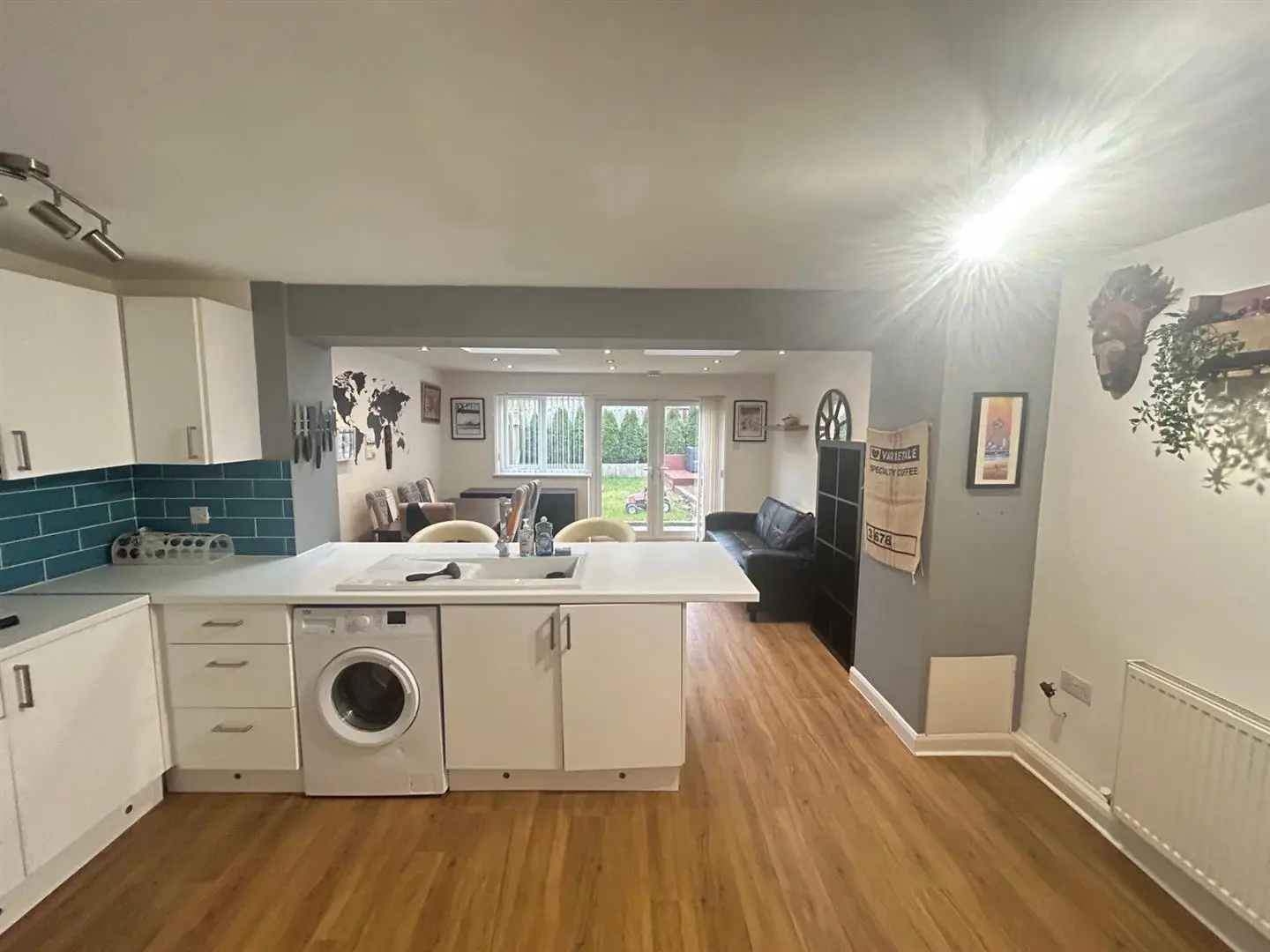The modern and most contemporary kitchen is fitted with a comprehensive range of wall, floor and drawer units with contrasting worktops incorporating a sink and drainer with mixer tap. The kitchen is warmed by a central heating radiator and benefits from laminated flooring, tiled splash backs, an integrated electric oven and hob with overhead extractor hood, a washing machine and a fridge freezer. An arch way leads into the garden room.