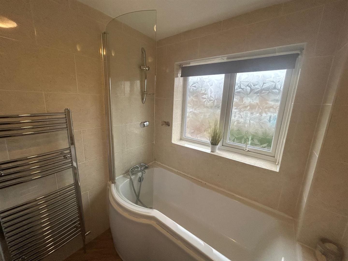 The modern bathroom has vinyl flooring, tiled walls, a UPVC double glazed window and is fitted with a suite comprising of a panelled bath, a wash hand basin, a low-level WC and a towel radiator.
