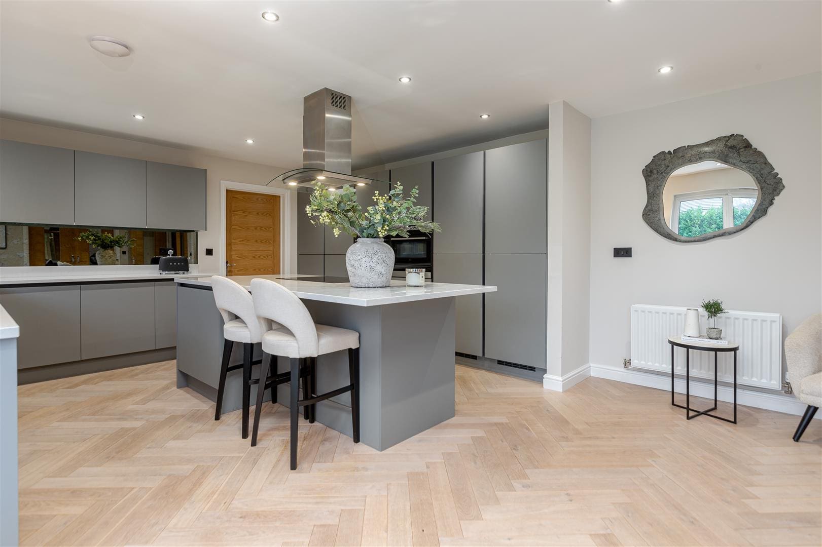 The open plan kitchen / dining room truly offers the wow factor. The dining room is warmed by a central heating radiator, is tastefully decorated in neutral tones and benefits from solid wood flooring and double glazed Bi folding doors which lead out to the patio area and rear garden beyond. The beautiful kitchen is fitted with a comprehensive range of wall, floor and drawer units with contrasting granite worktops incorporating an inset sink and drainer. The kitchen benefits from solid wood flooring, inset spotlights to the ceiling, a double glazed window, an electric oven, an induction hob and overhead extractor hood, a fridge freezer, dishwasher and a stunning centre Island with a seating area.