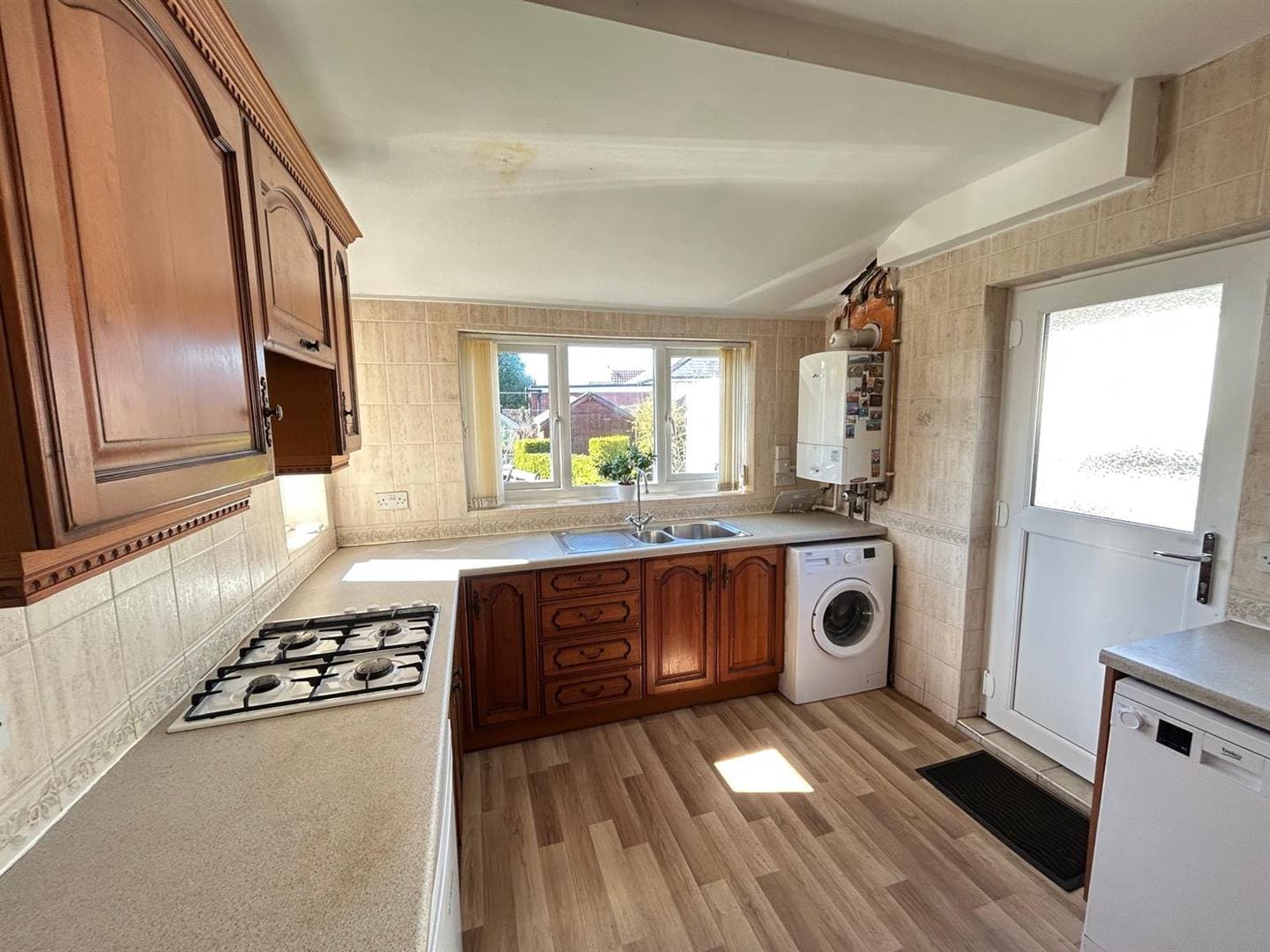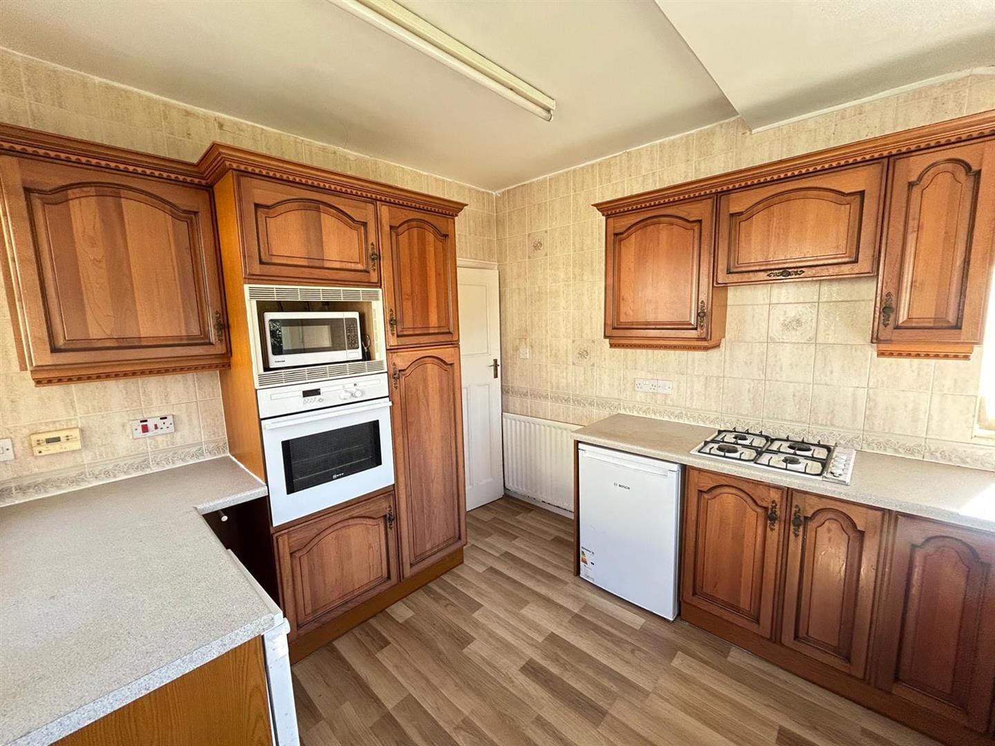 The kitchen is fitted with a range of wall, floor and drawer units with contrasting worktops incorporating a stainless steel sink and drainer. The kitchen benefits from vinyl flooring, UPVC double glazed windows to the side and rear elevations and an integrated double electric oven, and a gas hob and overhead extractor hood. A UPVC door leads out to the side elevation of the property.