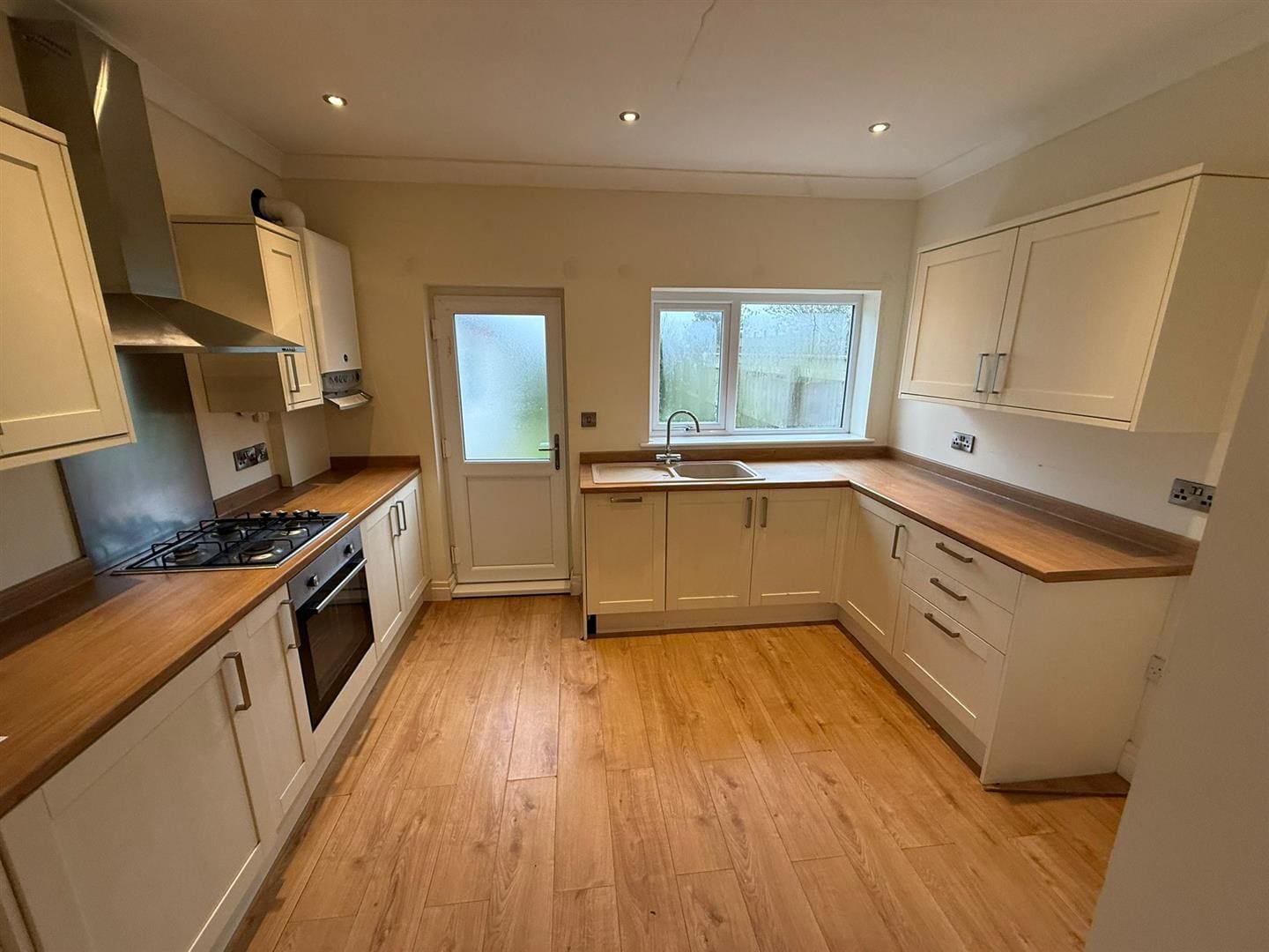 The modern and most contemporary kitchen is fitted with a comprehensive range of wall, floor and drawer units with contrasting worktops incorporating a composite sink and drainer. The kitchen benefits from laminated flooring, a UPVC double glazed window overlooking the rear elevation of the property and an integrated electric oven with a gas hob and overhead extractor hood. A UPVC double glazed door leads out to the rear garden. The kitchen is open plan with the dining room.