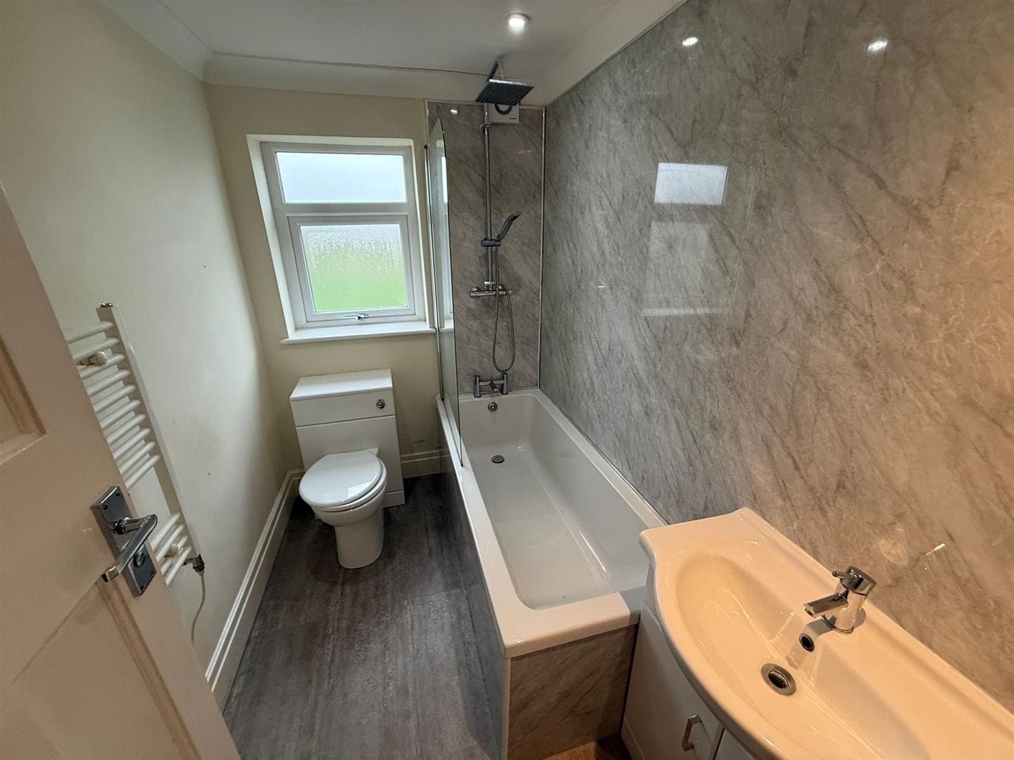 The modern bathroom has laminated flooring, a UPVC double glazed window with privacy glass and is fitted with a contemporary suite comprising of a panelled bath with over head shower, a wash hand basin inset on a vanity unit, a low level WC and a towel radiator.
