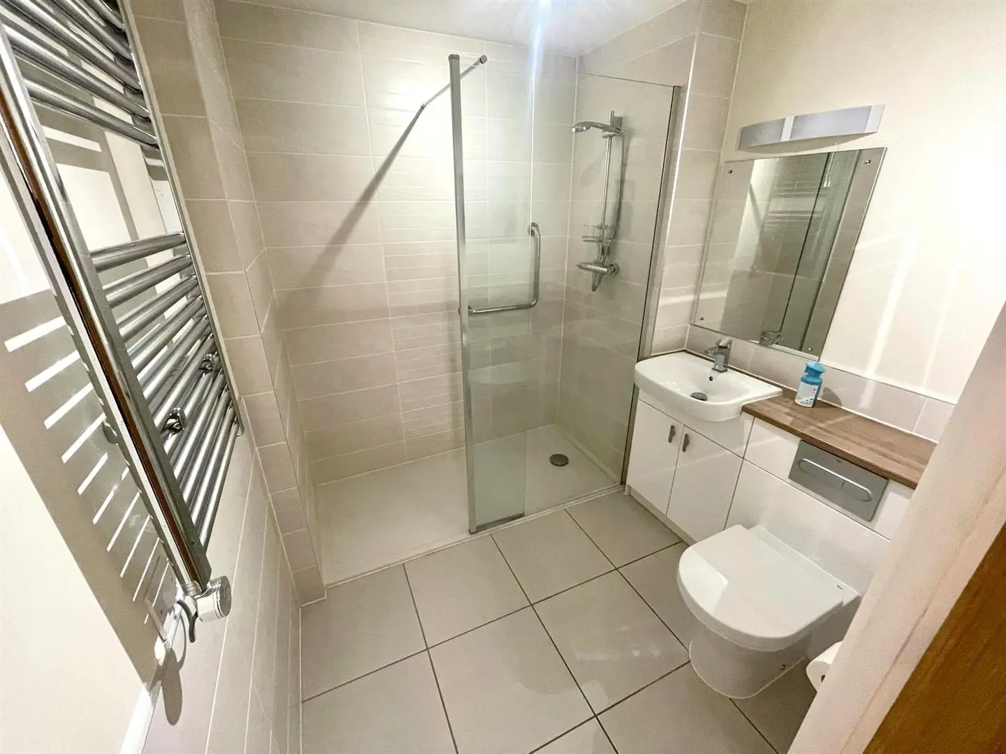 The shower room has a tiled floor and is fitted with a modern suite comprising of a walk in shower cubicle with shower, a low level WC, a wash handbasin inset into a vanity unit and a towel radiator.