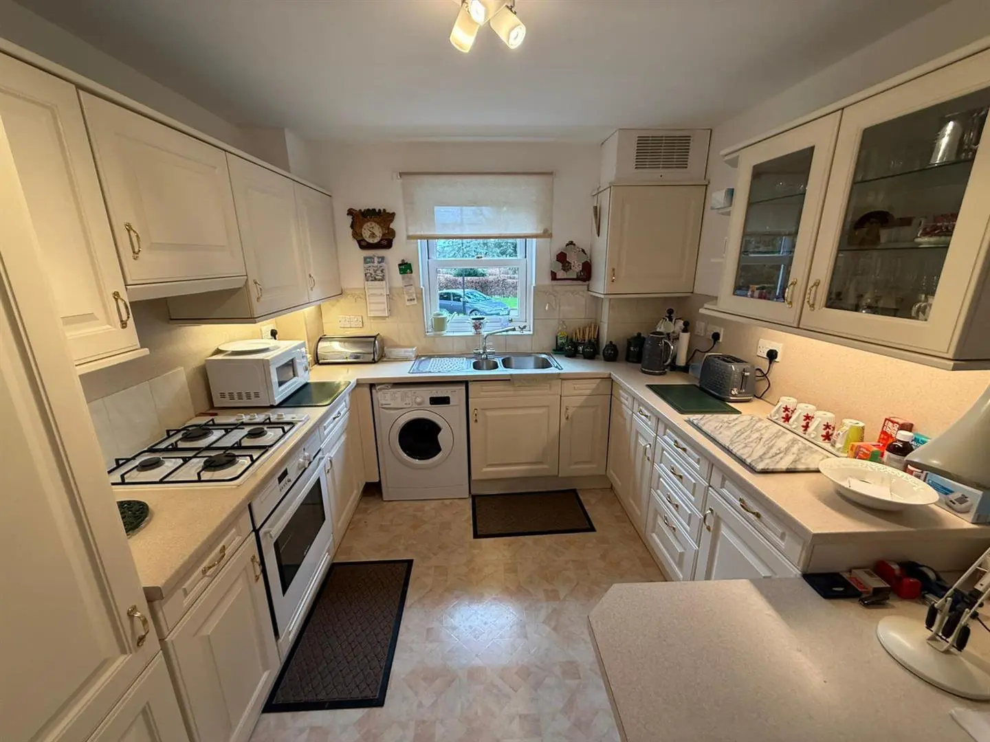 The kitchen is fitted with a comprehensive range of wall, floor and drawer units with contrasting worktops incorporating a stainless steel sink and drainer. The kitchen benefits from vinyl flooring, a wood framed double glazed window to the front elevation, including an integrated electric oven with gas hob and plumbing for an automatic washing machine.
